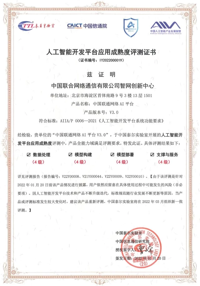 中国联通网络AI平台获中国信通院人工智能开发平台全能力域“四级”认证