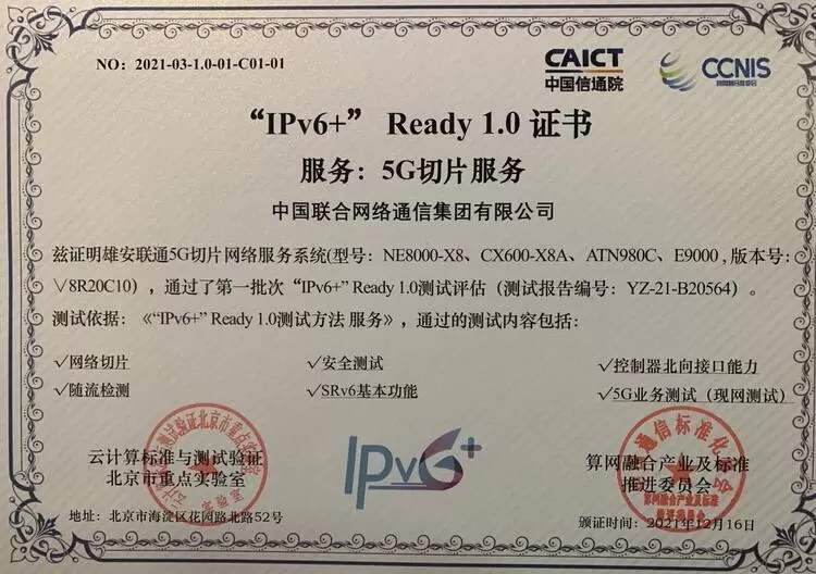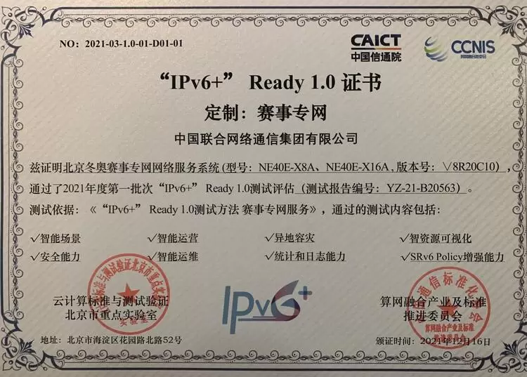 王志勤在“助力IPv6+行业融合升级,打造Ready权威测试品牌”主题演讲中指出,中国联通冬奥专网、雄安新城网络率先通过“IPv6+”测试评估,全国首获“IPv6+”ready1.0证书具有标志性的意义。