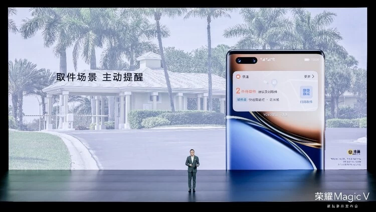 举个例子,当使用荣耀Magic V下班进入小区后,经过门口丰巢智能柜时,手机的主屏卡片会立马更新为快递取件信息,轻触即刻唤起,然后一键扫描取件,就能愉快地拿走年货快递,全程不需要特意去记忆“有几个快递”、“快递都放在哪里”等问题,也不需要到达丰巢智能柜后繁琐地输入取件号,便捷又省心。