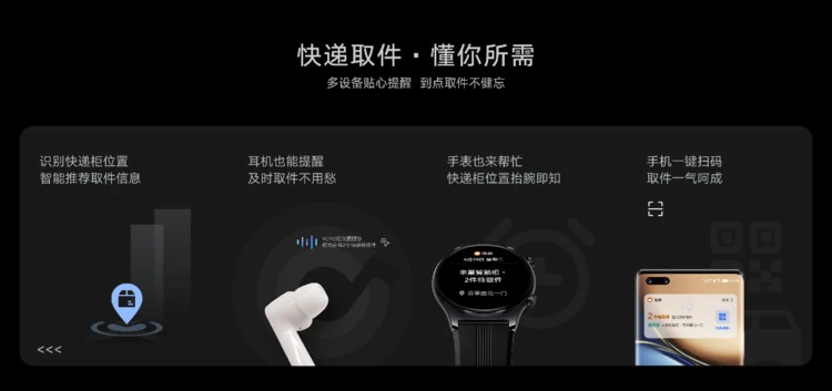 YOYO建议的快递取件服务还支持服务跨设备流转,服务信息能够以合适的方式呈现出来,既不打扰,也不错过。当我们没看手机屏幕时,YOYO建议也能通过耳机及时给出提醒,智能手表也会自动显示快递柜位置和快递取件信息,抬起手腕就能看到所有信息。