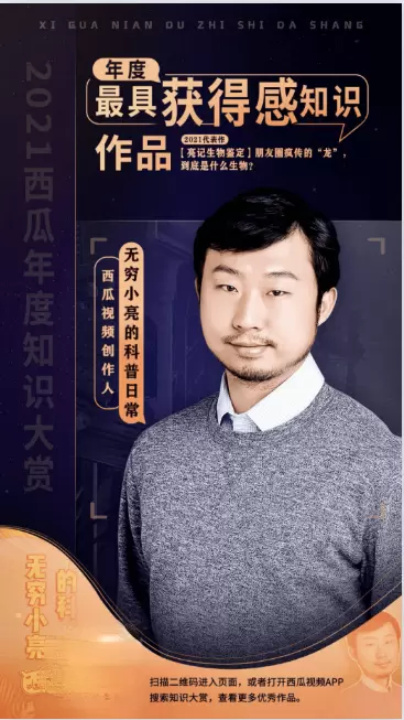 最终共计有15位创作人上榜。其中,在头条、抖音、西瓜视频三端拥有2142.9万粉丝的“无穷小亮的科普日常”的作品《【亮记生物鉴定】朋友圈疯传的“龙”,到底是什么生物?》获得「最具获得感知识作品」。