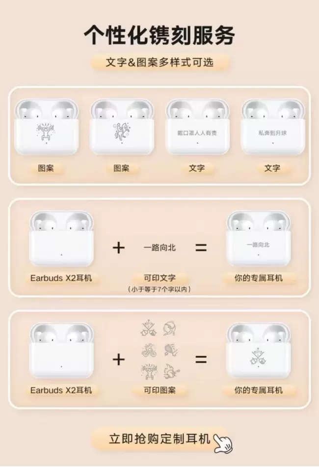 荣耀亲选的产品覆盖智慧家居、运动健康、出行、学习等多种生活场景,特别适合作为礼物。尤其是荣耀亲选Earbuds X2耳机,它有着时尚的外观、潮流的配色,具备超过28小时长续航、双麦通话降噪等功能优势,还提供免费定制个性化的镭射服务,支持文字和图案两种雕刻方式,你可以将新年的生肖图案、美好的祝福等雕刻上去,是一款“内外兼修”的TWS耳机。