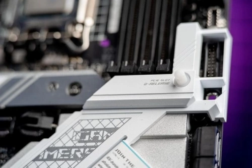 华硕Z690吹雪D4主板板载的4个M.2接口均配备高效散热片,有效降低M.2 SSD的温度,提升游戏加载速度。支持PCIe 5.0规格显卡,主插槽更加入显卡易拆键,拆卸显卡一键搞定。当然还有好评如潮的M.2便捷卡扣设计,无需工具和固定螺丝即可装卸SSD,非常方便。板载雷电4接针,可自行购买搭配相关雷电设备,享受高达40Gb/s的带宽,给予用户疾速传输新体验。