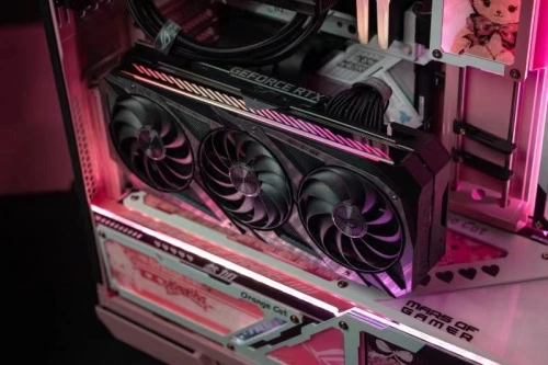 显卡性能对于大型游戏来说也是至关重要的,所以“我女朋友是战斗萝莉很能打”选用了一款发烧级显卡华硕ROG-STRIX-RTX3080-O10G,该显卡采用了2.9槽设计,散热片对比前代更大更厚,让轴流风扇拥有超大的散热面积将热量排出。显卡背面配备了2个PWM接口,可连接机箱风扇。显卡配备了三个8pin供电接口,可提供比公版更强的供电能力。参数方面,显卡拥有8704颗CUDA核心,GPU频率为1440-1935MHz,配备10GB GDDR6X高速显存,320bit位宽。