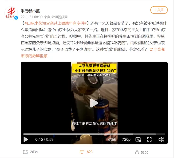 春节的脚步已越来越近,家家户户无不忙着准备年货。日前,有位山东小伙为父亲送上了特别的年货,他将泡好的养生茶灌到白酒瓶里,希望远在老家的父亲少喝点酒,还说“我小时候他就是这么骗我吃药的”。“孩子费了不少功夫”,收到酒的父亲表示十分理解儿子的心意。