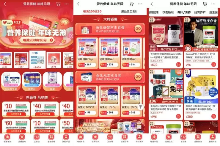 围绕不同人群的特点以及对于健康的需求差异,京东健康还在年货节期间带来了老年人常备的调节三高、骨骼健康保健品,Z世代关注的增强免疫、维生素矿物质营养品,孕妇所需的叶酸、DHA鱼油及婴幼儿所需的特医食配方食品、益生菌,以及适合职场人士的改善睡眠、养肝清肺、肠胃养护、养颜/抗氧化、运动营养类等多个类别的营养保健产品,为不同人群打造个性化的专属健康年货。在挑选健康年货的同时,消费者还可享受每满200减30、健康好礼买一送一、百亿补贴低至5折等福利,并依托京东健康“春节也送货”服务实现“让年货到家”,让“精养型”生活触手可及。