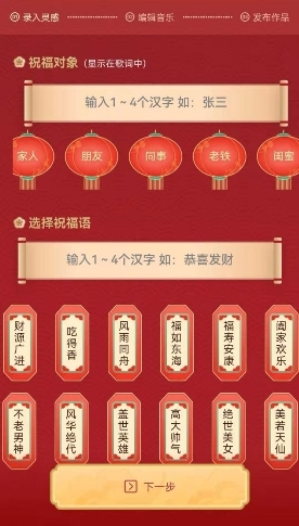“网易天音”小程序通过创作拜年歌曲,创新拜年祝福形式,在歌曲创作全过程中融入财神、虎年、好运签、红灯笼等元素,营造了过年欢乐喜庆的氛围感。用户可以在首页点击“立即创作”,输入祝福对象、选择祝福语,即可自动生成拜年歌曲,一键分享给好友。