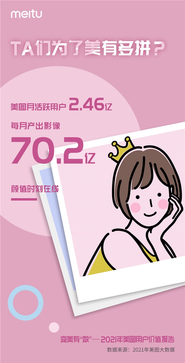 不仅深受用户喜爱,美图也获得权威机构认可。国内权威移动互联网商业智能服务商Quest Mobile公布的《2021年度中国移动互联网实力价值榜》显示,美图秀秀凭借9538.92万的月活跃用户再次蝉联图片美化赛道用户规模NO.1应用,美颜相机也蝉联拍照摄影赛道用户规模NO.1应用。
