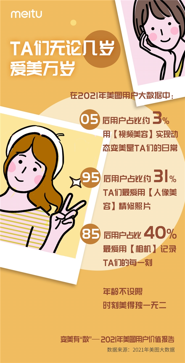 美图用户中,“85后”用户最爱用相机功能拍下美好时刻,用照片记录生活;“95后”用户最爱用人像美容功能精修照片,让每一面的自己都变得更好看;“05后”用户最爱使用视频美容功能,用视频功能展现动态美。