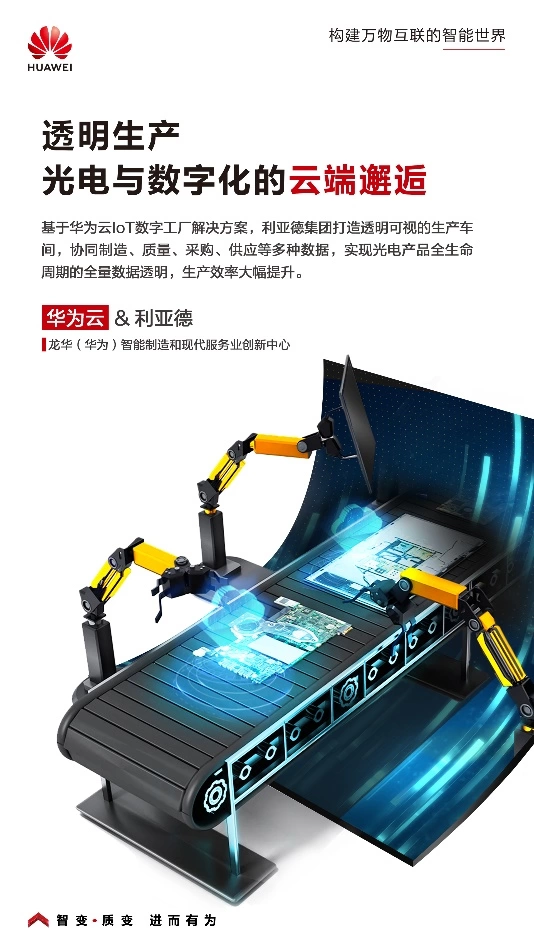 LED商显大屏作为数字化呈现的载体之一,现阶段产业机遇与挑战并存,“先进制造”是企业发展的重要一步。作为一家全球视听科技产品及应用平台领军企业利亚德光电集团选择牵手龙华(华为)智能制造和现代服务业创新中心,打造利亚德深圳数字工厂。基于华为云IoT数字工厂解决方案,利亚德集团打造透明可视的生产车间,协同制造、质量、采购、供应等多种数据,实现光电 产品全生命周期的全量数据透明,生产效率大幅提升。