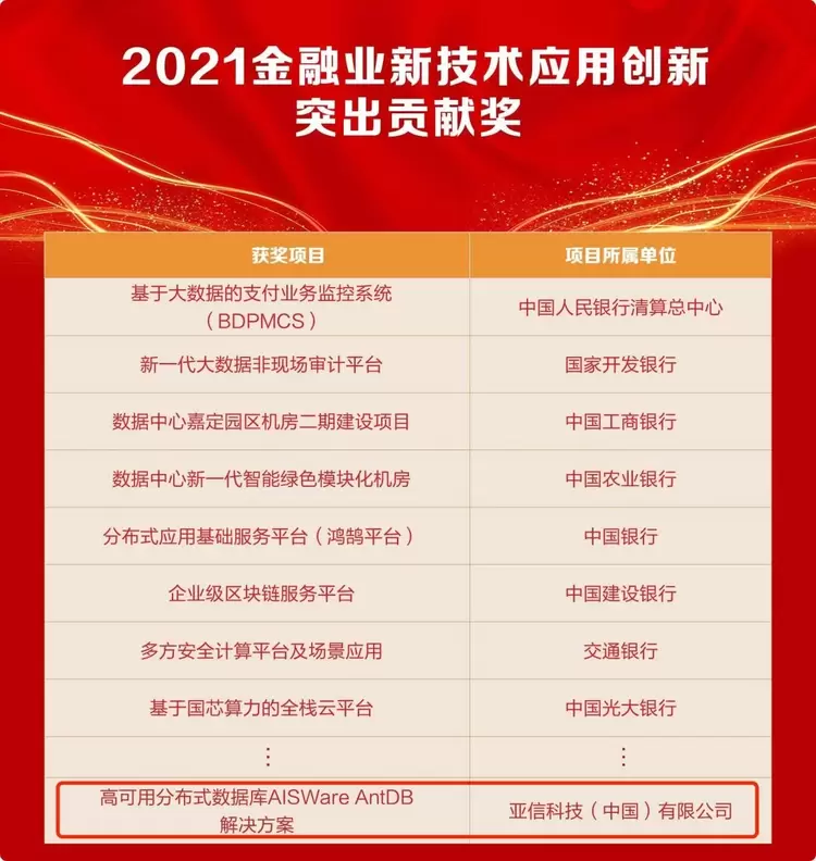 日前,中国人民银行主管《金融电子化》杂志公布了“2021第十二届金融科技应用创新奖”榜单,亚信科技数据库产品AISWare AntDB(以下简称:AntDB)及其解决方案凭借在金融领域的安全、高效、广泛应用,荣获“2021金融业新技术应用创新突出贡献奖”。该奖项旨在表彰对金融科技创新和业务发展做出突出贡献的金融机构与科技企业,促进全行业技术革新、服务优化、产业升级。