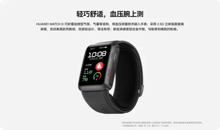 目前,慢性病的发病率越来越高,尤其是高血压,已经成为全世界范围内导致人类死亡的重要因素,据《柳叶刀》相关报道,很多人不知道自己患有高血压。华为近期发布了其首款腕部心电血压记录仪HUAWEI WATCH D,不仅可以实现单次血压测量,让随时随地的血压测量成为可能。而且还可通过PPG技术实现连续无感的血压趋势监测,让用户获得全天候的血压变化趋势。