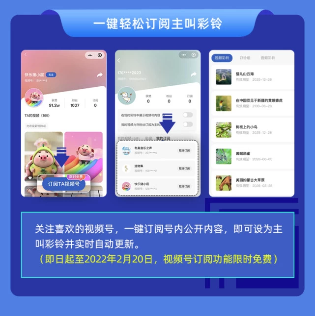 5G视频号支持订阅功能,用户可关注感兴趣的大V或普通用户,订阅该账户的所有公开内容,还可将订阅的视频一键设置为主叫彩铃,将喜爱的视频内容收入囊中,并享受实时更新,让新年的每一天都拥有新心情。