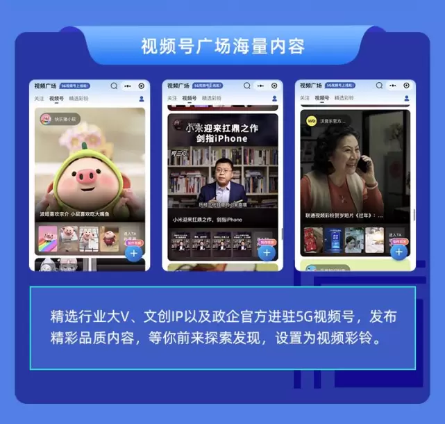 “视频号”顾名思义,必备的当然是一众精美短视频。中国联通视频彩铃邀请了众多行业大V、文创IP以及政企官方入驻5G视频号平台,制作发布了海量高品质、创意新、题材广的视频内容。
