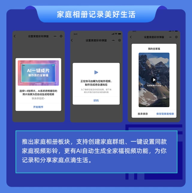 5G视频号还专门打造了家庭相册功能,用户可联合家庭成员创建家庭群组,一键为家人设置同款视频彩铃,并支持AI自动生成全家福视频。今年受疫情影响,不少用户无法返乡团圆,AI全家福是感受“云端相聚”、补全遗憾的不二选择。