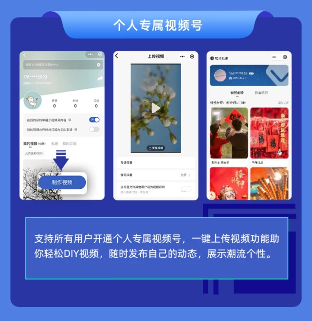 不仅如此,用户完成注册后,将拥有个人专属视频号。中国联通视频彩铃为广大用户准备了丰富的模板并支持视频上传。如果你是视频小白,可以在模板的加持下,轻松搞定“高难度”、“高颜值”的视频制作,满足你的视频分享欲,追赶视频拜年新潮流。