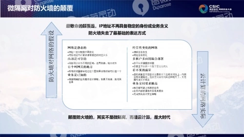 作为云安全的一种产品,业界一直流传一句话,它必将而且正在颠覆防火墙,那么这句话究竟反映了什么样的技术判断和发展趋势呢。在国内云安全产品技术厂商蔷薇灵动看来,颠覆防火墙的其实不是这种技术,而是云计算。防火墙有其诞生的历史背景,在防火墙被设计的时候,网络是静态的,IP地址具备稳定的身份属性,也就是说IP地址与资产之间具备稳定的一一对应关系,因此这个时候就出现了以IP地址作为基本表达方式的防火墙技术。但是随着云计算、物联网等基础设施的广泛部署,IP地址不再是一个被静态配置的常数,而是变成了一种池化的,动态分配的变量。换言之,IP地址不再具备资源的标识信息价值,而是作为一个通信用的临时性变量而存在。这带来一个非常重大的影响,那就是以IP地址为基本元语的防火墙失去了最核心的表达方式。取而代之的则是包括微隔离在内的以逻辑标识为基本元语的新一代云安全技术。