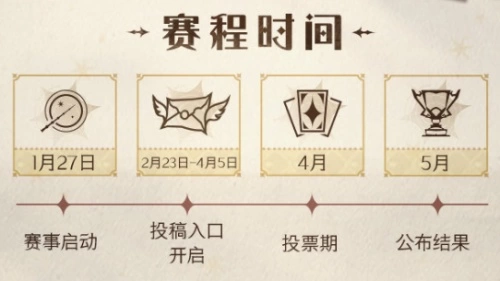 赛事启动期为1月27日,投稿开启期为2月23日至4月5日,期间有将近一个月的时间,玩家可以参加、呼吁自己喜爱的画师参加,都是留有充足的准备和宣传时间,然后4月份举办玩家之间投票,官方在5月份宣布结果,历时接近半年,时间跨度大的赛程可以更好更多收集玩家间的优秀作品和投票,也表现了官方对于该比赛的重视和充足准备。