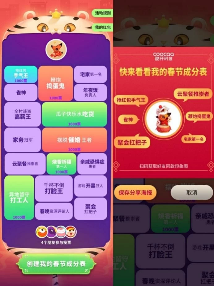 在整个活动期间,用户均可通过移动设备扫描大屏端的活动二维码,生成“我的春节成分表”,不论是“春晚资深评论人”还是“聚会扛把子”,亦或是“抢红包手气王”……都是用户独一无二的春节专属标签。同时,用户还可以分享链接邀请好友一同来参与活动,不仅能累计获得影响力,在此过程中评价好友春节成分更有机会获得随机现金红包,趣味互动的同时,也能将春节好礼收入囊中,用户自然参与热情高涨。