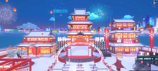 视觉方面,咪咕圈圈升级游戏引擎,借助贴图、光影、环境光遮蔽等手段,不断逼近现实世界。“国潮冰雪舞台”中大量古色古香的建筑,加以红灯笼、钟鼓楼及传统服饰等喜庆春节元素,让国风年味更加立体。同时,小镇中铺设的大量LED屏幕和广告牌用于承载各类媒体文件,并增设广告关联商品一键加购的能力,使虚拟世界具备无限潜力的商业承载模式。