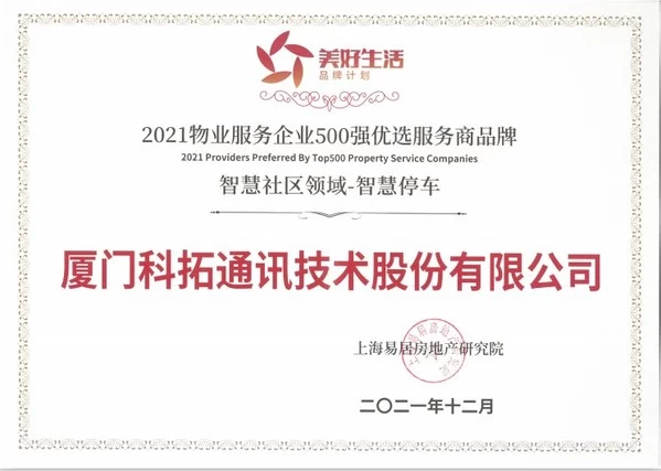 此外还有由慧聪物联网、慧聪电子网颁发的“2021(第十八届)中国物联网产业品牌-十大出入口控制品牌”、中国停车网、《城市停车》颁发的“2020-2021医院智慧停车示范企业”、上海易居房地产研究院颁发的“2021物业服务企业500强优选服务商品牌,智慧社区领域-智慧停车”等多项荣誉。