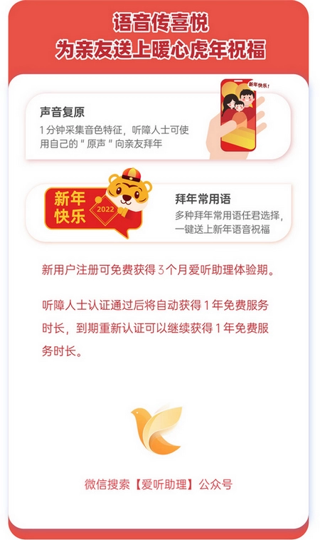 新春之际,科大讯飞为听障人士送上了一份真挚的新年礼物——无障碍智能通信产品“爱听助理”正式上线并向听障人士免费开放使用,陪伴听障人士一同去拜年,共享新春的喜庆氛围。