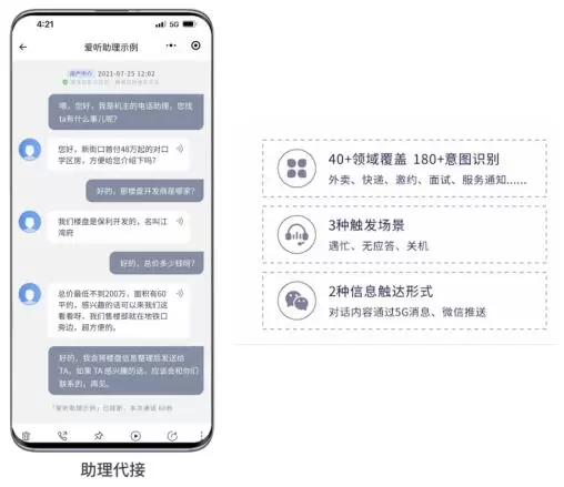 助理代接。2016年,讯飞首创“代接电话”的智能应答产品并持续打磨;2019年正式上线后,累计服务用户超过3000万。当遇到无法接听电话的情况时,爱听助理可支持智能识别40余行业、超180个来电意图并自动应答,允许设置个性化形象表达和多方言接听方式,让虚拟接听助理的回复更贴近用户的沟通习惯。