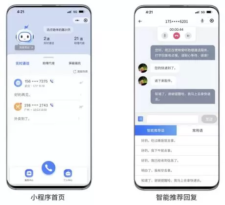 实时通话。爱听助理支持通过微信小程序接打电话,将健听人的语音精准识别为文字供听障人士查看,在听障人士打字回复时,智能推荐回复语,缩短打字时间,让通话顺利进行。