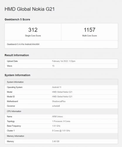 外媒表示,诺基亚G21采用紫光T606芯片组和4GB RAM组合,预装Android 11,Geekbench单核跑分为312分,多核跑分1157分。