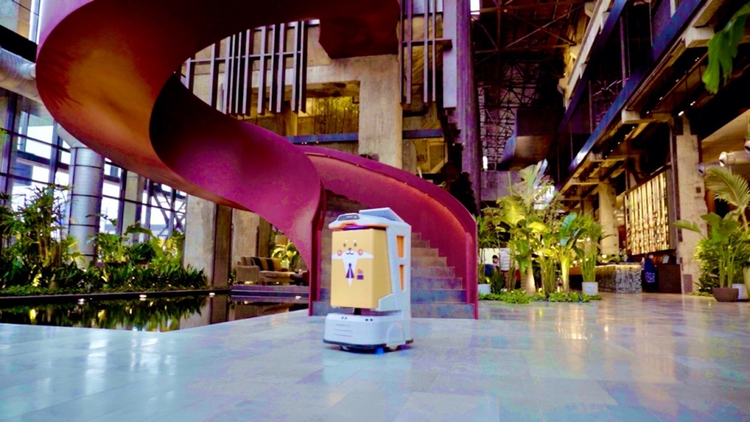 在首钢园香格里拉酒店的九号方糖配送机器人
