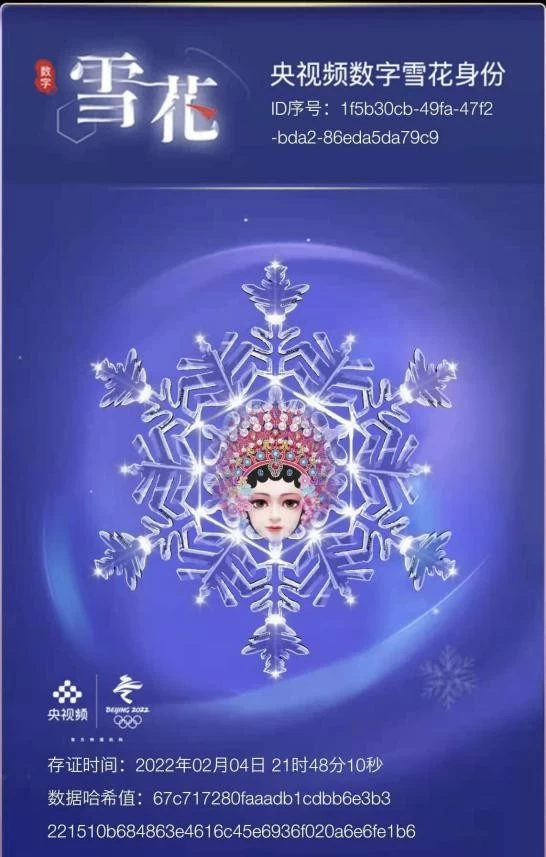 “世界上没有两片一样的雪花”,央视频的“数字雪花”通过区块链技术也保证了每朵数字雪花的独一无二。央视频通过将用户ID与区块链技术结合,生成“我的冬奥数字雪花”证书,附有雪花ID序号、存证时间、授时凭证编号、数据哈希值等独特性与唯一性的信息,形成用户珍贵的数字资产,并能永久保存雪花ID,不被篡改、不被盗号。