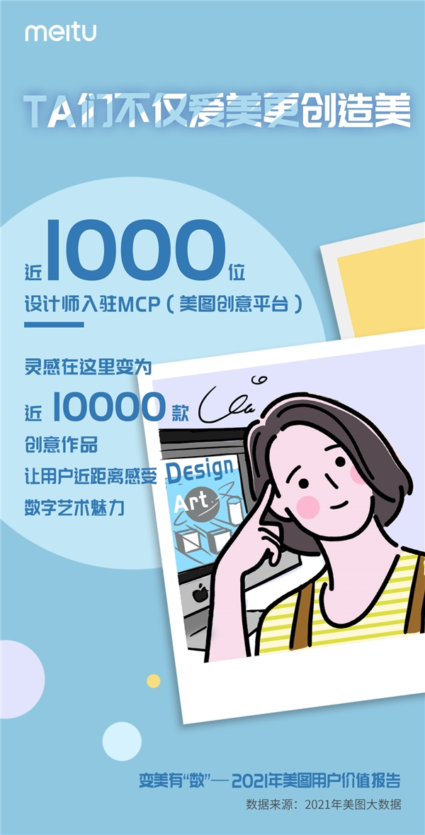 此外,以技术为核心,美图公司不断激发创作者的创作热情,推出的MCP(美图创意平台)不仅帮助用户将想象落地为可以体验的AR效果,也为众多优秀创作者提供了创作平台。2021年,近1000位设计师入驻MCP(美图创意平台),创作了近10000款创意作品,为美图公司提供了源源不断的创作灵感。