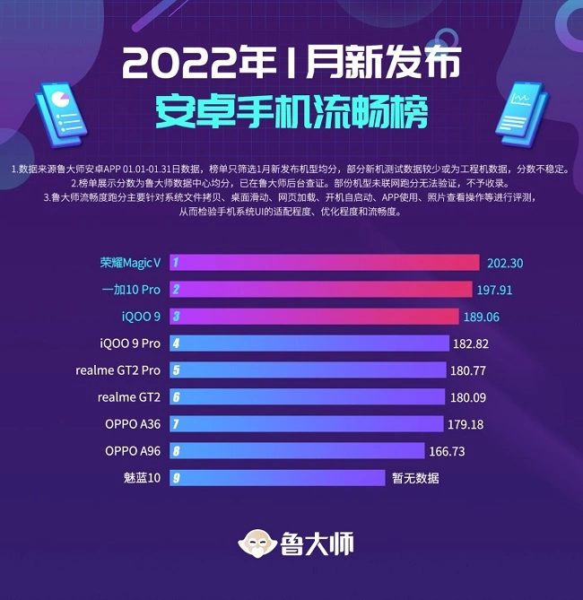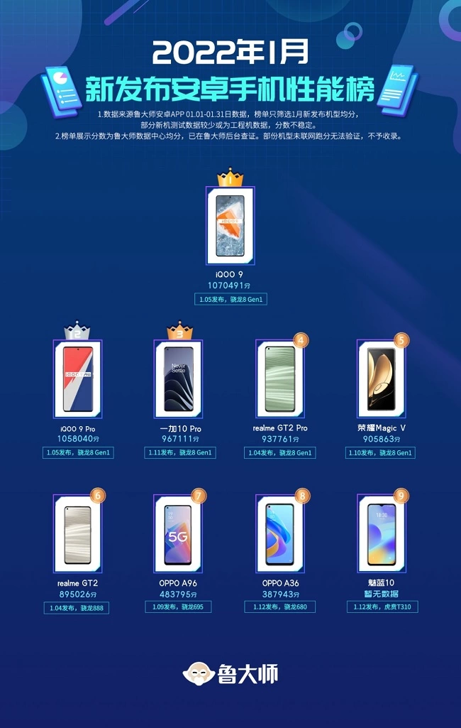 鲁大师1月新机排行榜:iQOO 9性能最强,荣耀Magic V夺冠流畅榜
