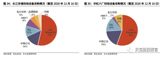 除中微公司外,北方华创也是国内主要蚀刻机生产厂家。但根据亚化咨询统计数据,截至2020年12月16日,长江存储累计招标348台刻蚀设备,其中美国厂商Lam Research中标187台,占总采购数量的比例为54%。