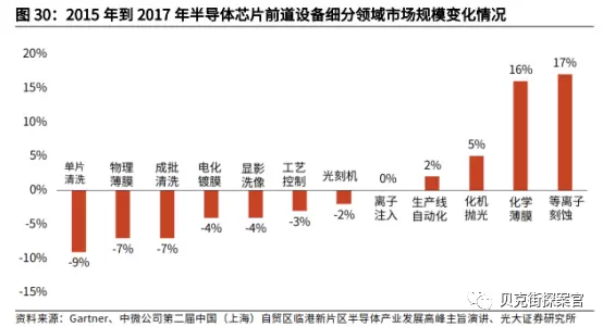 根据Gartner数据显示,2015年至2017年,等离子刻蚀设备市场规模复合增速为17%,超过其他前道设备市场增速。目前,存储器件正从2D向3D结构转变,逻辑器件向3nm等技术节点发展,这些工艺的变化使得等离子体刻蚀设备成为更关键的设备,其市场增速超过光刻机和其他前道设备。