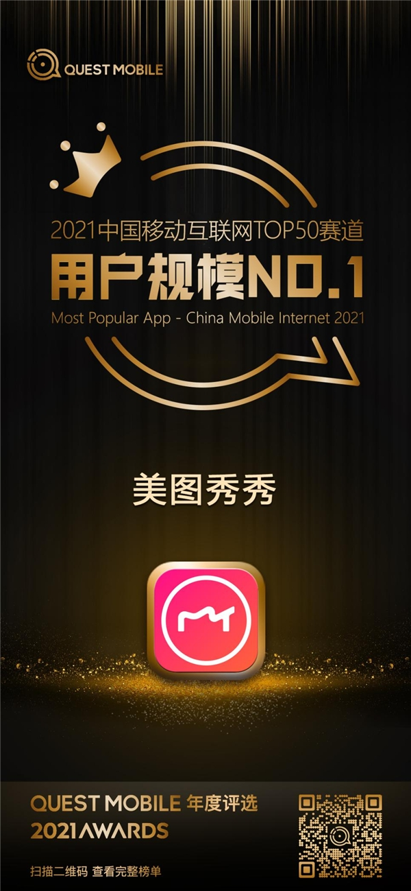 近期,QuestMobile发布了《QuestMobile 中国移动互联网发展“启示录”(2022)》。在“2021年度中国移动互联网实力价值榜”中,凭借9538.92万的月活跃用户(MAU),美图秀秀再次蝉联2021中国移动互联网TOP50赛道用户规模NO.1,是名副其实的影像美化领域强劲选手。