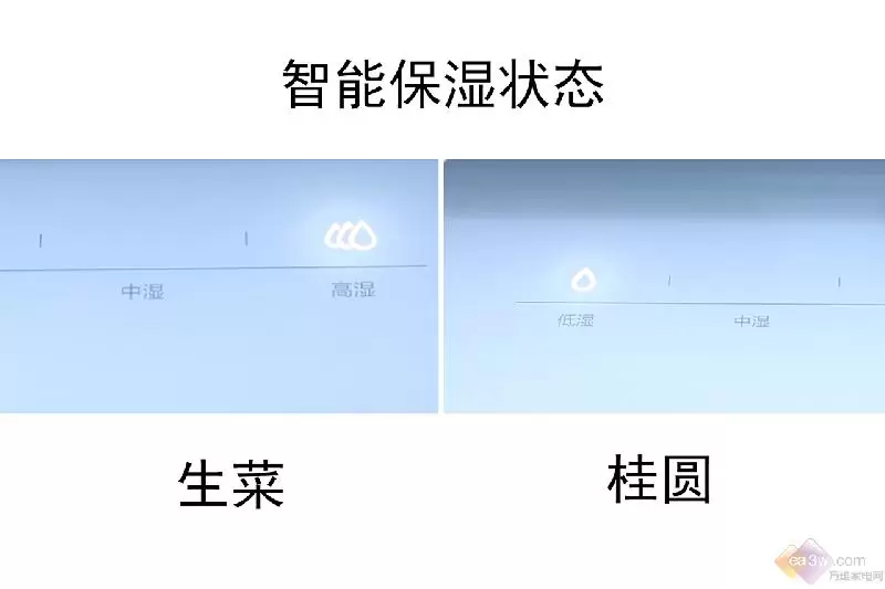 我们将圆生菜放入保湿抽屉后,经过了一段时间我们发现其保湿度可以自动调节为高湿状态,而将桂圆放入保湿抽屉一段时间后,其保湿度被调节为低湿状态,可见其主打的“AI智能控湿”也是名不虚传的。