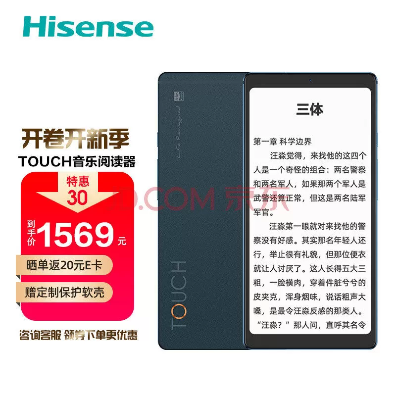 目前,海信TOUCH音乐阅读器在京东商城火热销售中,活动期间特惠30元,到手价1569元!另外购机赠送定制保护软壳,晒单还能再返20元E卡。