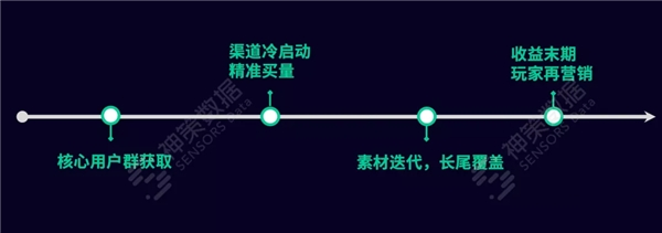 买量在其他行业中通常叫做“获客”“推广”等,游戏行业的买量有一个明显的特征:目标受众垂直。因此,游戏买量的全生命周期需要围绕核心用户群做扩散和渠道跑量,这个过程中会涉及营销素材的创意和迭代,以及对存量用户的再营销。如下图所示: