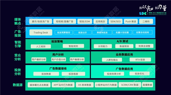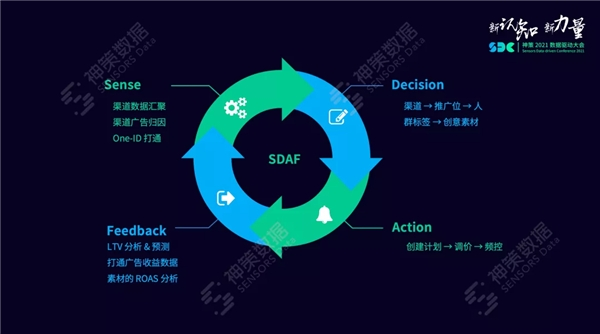 当我们面向核心用户群做了一些创意营销的动作,那么这些创意就可以在广告平台开始跑量了。此时,我们要做的核心就是闭环,也就是神策数据提出的「基于数据流的企业运营框架 SDAF 闭环」。