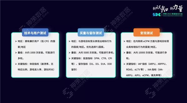 比如,在技术与用户测试阶段,可以选择低 CPI 的国家/地区,尽可能降低获客成本;在买量与留存阶段,选择与游戏目标受众表现出相似行为的国家/地区,侧重于精准用户触达;在变现测试阶段,选择在内购和 eCPM 方面与游戏目标受众具有相似行为的国家/地区,以 ARPU、ARPPU、ROAS 等关键指标评估投放效果。详细如下图所示: