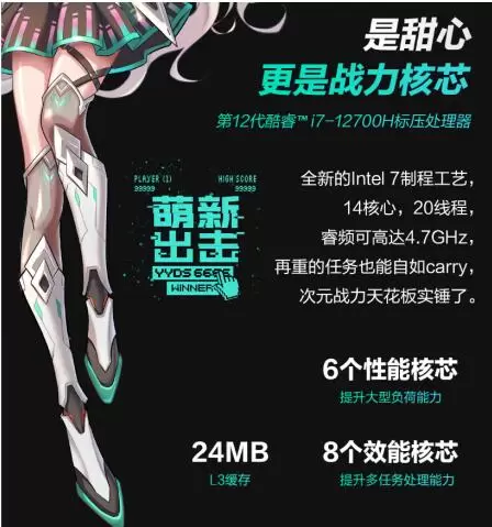 搭载12代酷睿i7-12700H处理器,6性能核8能效核,20线程,24MB缓存;
