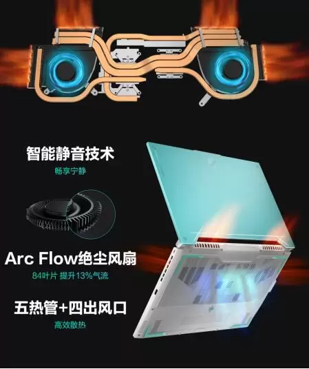 升级版冰川散热架构,全新智能静音技术,84叶片Arc Flow绝尘风扇