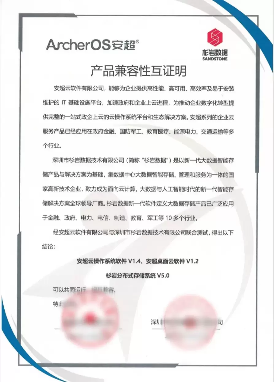 近日,安超云软件有限公司(以下简称:安超云)旗下安超云操作系统软件、安超桌面云软件与杉岩数据明星产品杉岩分布式存储系统完成兼容性互认证。测试结果表明,双方产品在兼容性、稳定性、安全性等方面表现优异,整体运行流畅,性能卓越!