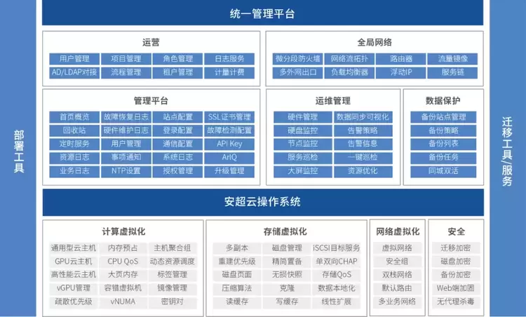 安超云操作系统是一套国内首款基于服务器架构的通用型云操作系统,具有软硬件解耦、应用优化、支持混合业务负载等特点。为企业提供高性能、高可用、高效率及易于安装维护的IT基础设施平台,加速政府和企业上云进程,为推动企业数字化转型提供完整的一站式企业上云的云操作系统平台和生态解决方案。该产品于2021年底正式发布1.5版本,本次升级发布,安超云操作系统展现出了“好用易用”的产品优势,其独特的业务优化技术、数据安全技术、运维管理技术的大幅提升,为广大用户进一步实现贴近用户业务、简化用户运维、保障数据安全的目标。