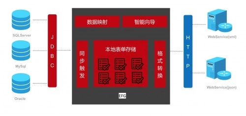 1)通过外部字段组(简称EFG)跟其他的系统对接。第一种是跟其他第三方系统的数据库通过JDBC去进行连接。数据库支持SQLserver、Oracle、MySQL,以及SAP IQ这样的列数据库。这种连接是双向的,魔方网表既可以去读第三方的库,也可以去写。外部字段组连接的优势是可以在本地存储。本地存储的好处是数据是两份,当在魔方网表做写操作时,若此时集成的第三方系统宕掉或者网络断了,不会影响当下的操作,因为数据操作已经保存在本地魔方网表的数据库里,等网通了以后,魔方网表跟其他系统之间会自动进行数据同步,数据就自动同步到第三方的系统中。因此,第三方系统和网络的状况不会影响魔方网表的系统使用。这是在操作级别上去做集成很有用的一个特征。