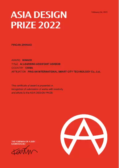 亚洲设计奖(Asia Design Prize)由韩国设计之声主办,是一项面向全球设计师的国际性大奖。2022年亚洲设计奖收到了来自世界各地29个国家的1830个参赛作品,由世界著名设计师Karim Rashid等36名评委进行公正、客观的评审,最终,平安知鸟AskBob智能行业专家以美观性、独创性、实用性脱颖而出、斩获大奖。