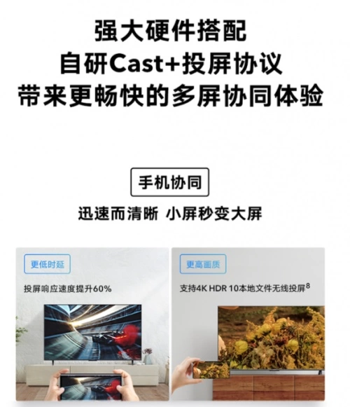 品质音画,才能带来极致体验。就像刚刚提到的,荣耀智慧屏X2系列一直坚持开关机无广告,秒级开机让用户得到更加顺畅舒心的体验,开机即可享受高品质影音体验。打造智慧屏品类以来,荣耀智慧屏一直以强大的多屏协同能力走在行业前列,实现了超低时延投屏,即便在弱网/干扰环境网络仍能做到流畅播放不卡顿、无花屏,显著提升用户体验。此外,荣耀智慧屏X2系列还推出了HDR10手机本地视频无线投屏,其中55/65英寸支持4K HDR10,进一步提升用户的多屏协同体验。