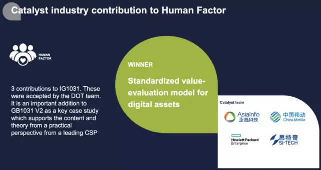 智慧中台价值评估体系项目是中国移动构建统一的企业数字化转型评估体系的一次重要探索,由中国移动信息技术中心发起,由亚信科技、HPE、思特奇等公司共同参与。评委会在颁奖词中指出:该催化剂项目有3个研究成果被TMF标准文档管理小组接受并纳入 IG1031标准;作为全球领先运营商的重要实践案例,它还为 GB1031 V2标准提供了重要的内容和理论补充。
