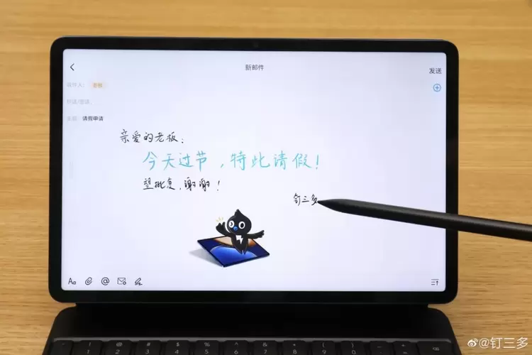 2022年2月14日,在这个特别的日子里,荣耀平板与钉钉在微博联手官宣,为荣耀平板用户送上一份“爱的礼物”——联合打造的“原笔迹手写邮件”新功能正式上线。钉三多同学已经第一时间在荣耀平板V7 Pro上使用了这一功能,手写请假邮件申请过节。